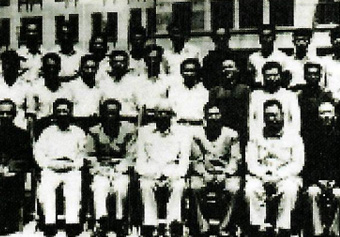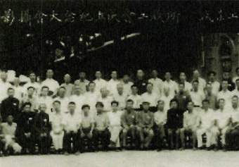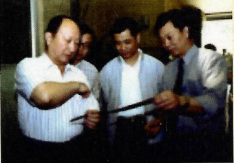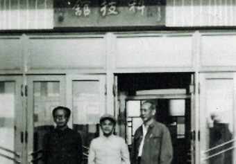 1982年科技馆落成,并举办了建院30周年学术报告会和成果展览,中国书法协会创始人、“马背书法家”舒同(左二)为科技馆题字,时任钢研总院院长的王瑜(右一)陪同其视察。